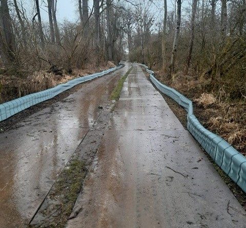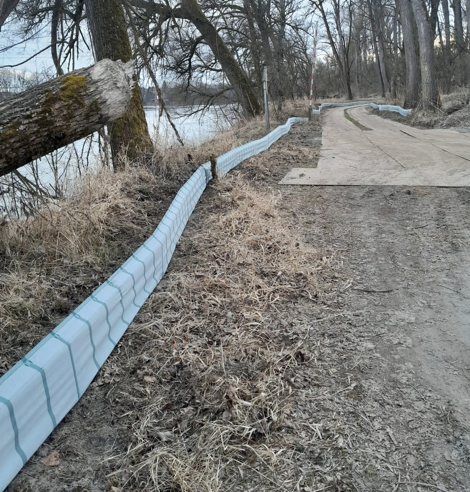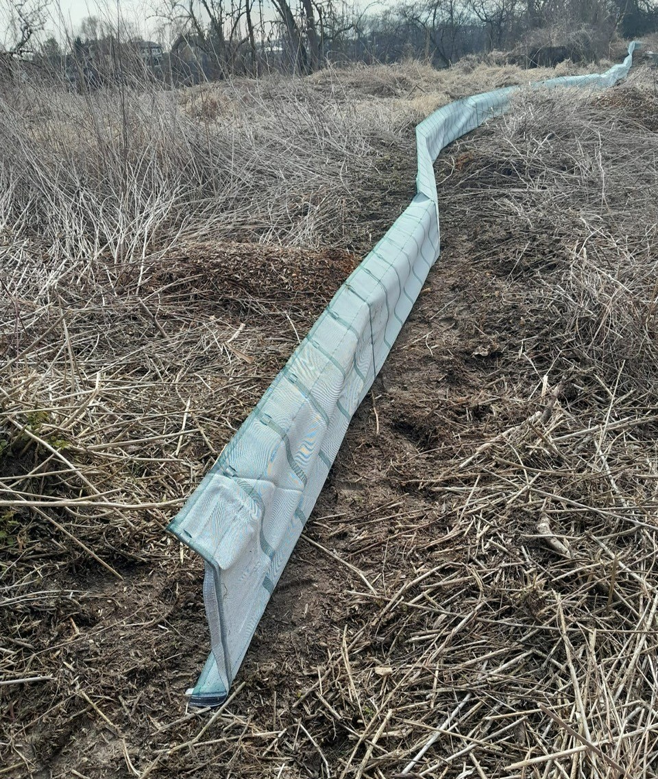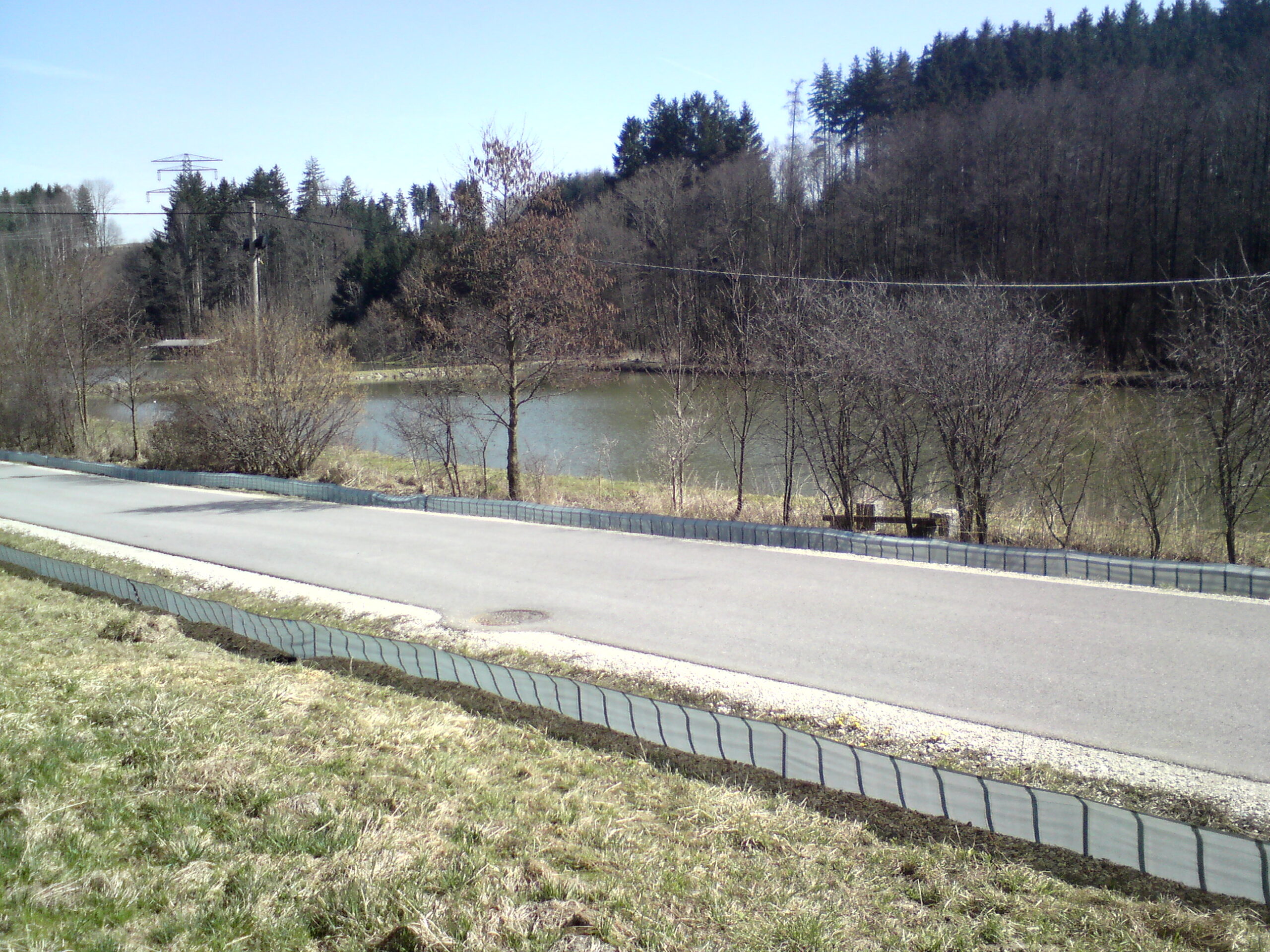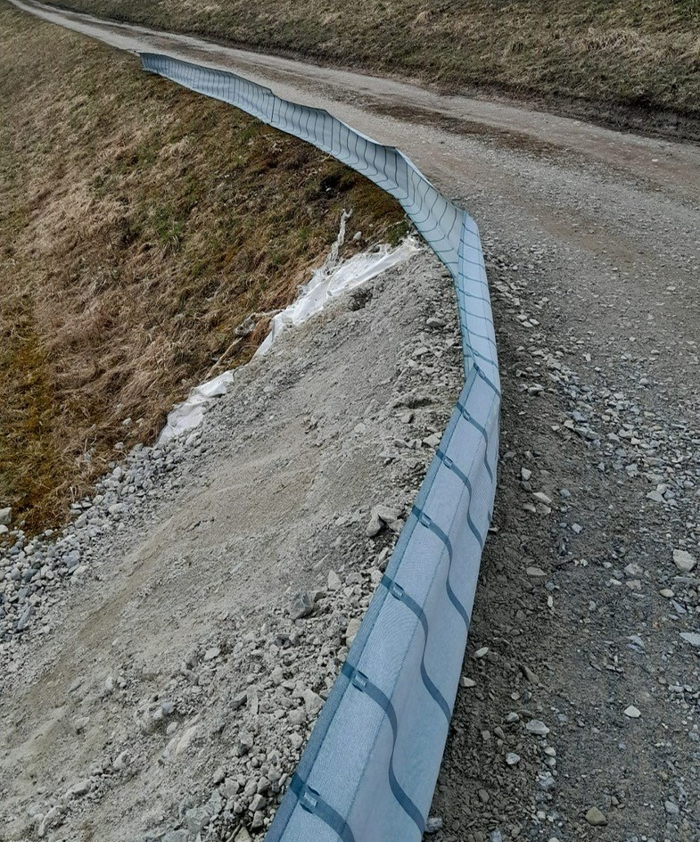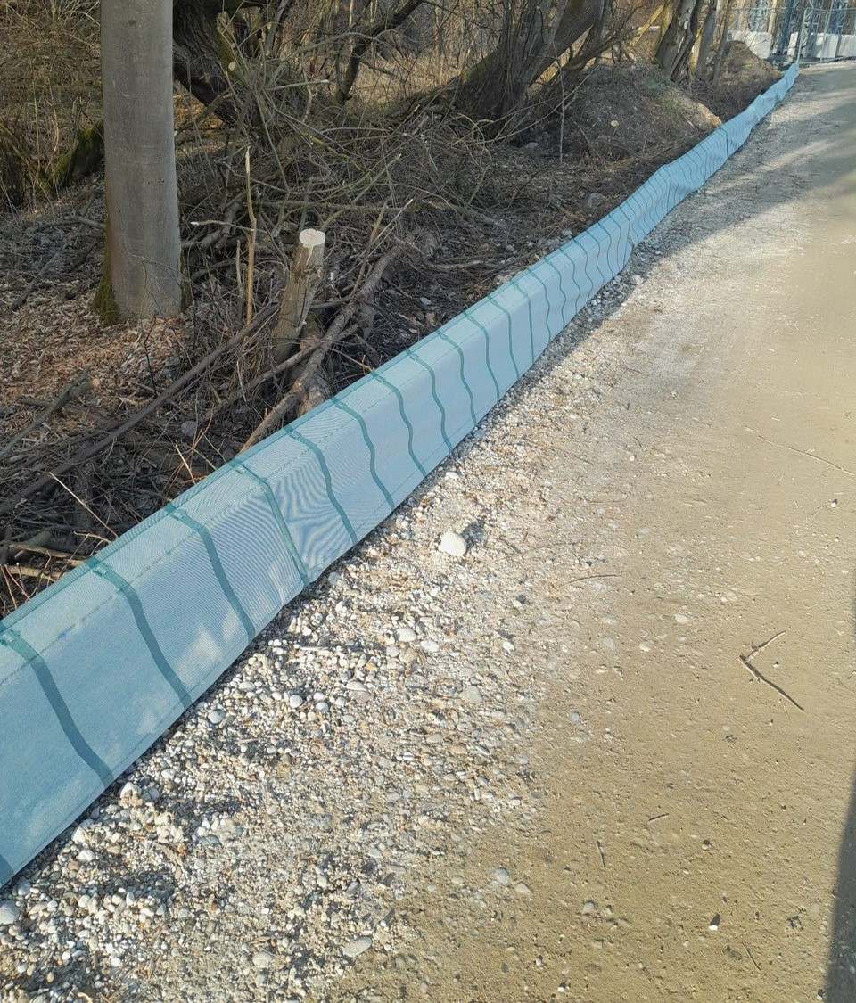 Self-supporting construction. Support posts have an angle on top (overclimbing protection). The fabric is made of polyester yarn in longitudinal direction and polypropylene yarn firing direction. The non clear-sighted fabric is UV resistant and weather resistant. Hot galvanised hold-down clamps in simple but effective construction are available on request. When using hold-down clamps, the foil does not have to be digged in the ground. If you want to fasten the foil on existing fences, we offer the foil with brass eyelets in distances of 75 cm. This ensures a firm and permanent connection of foil and fence.