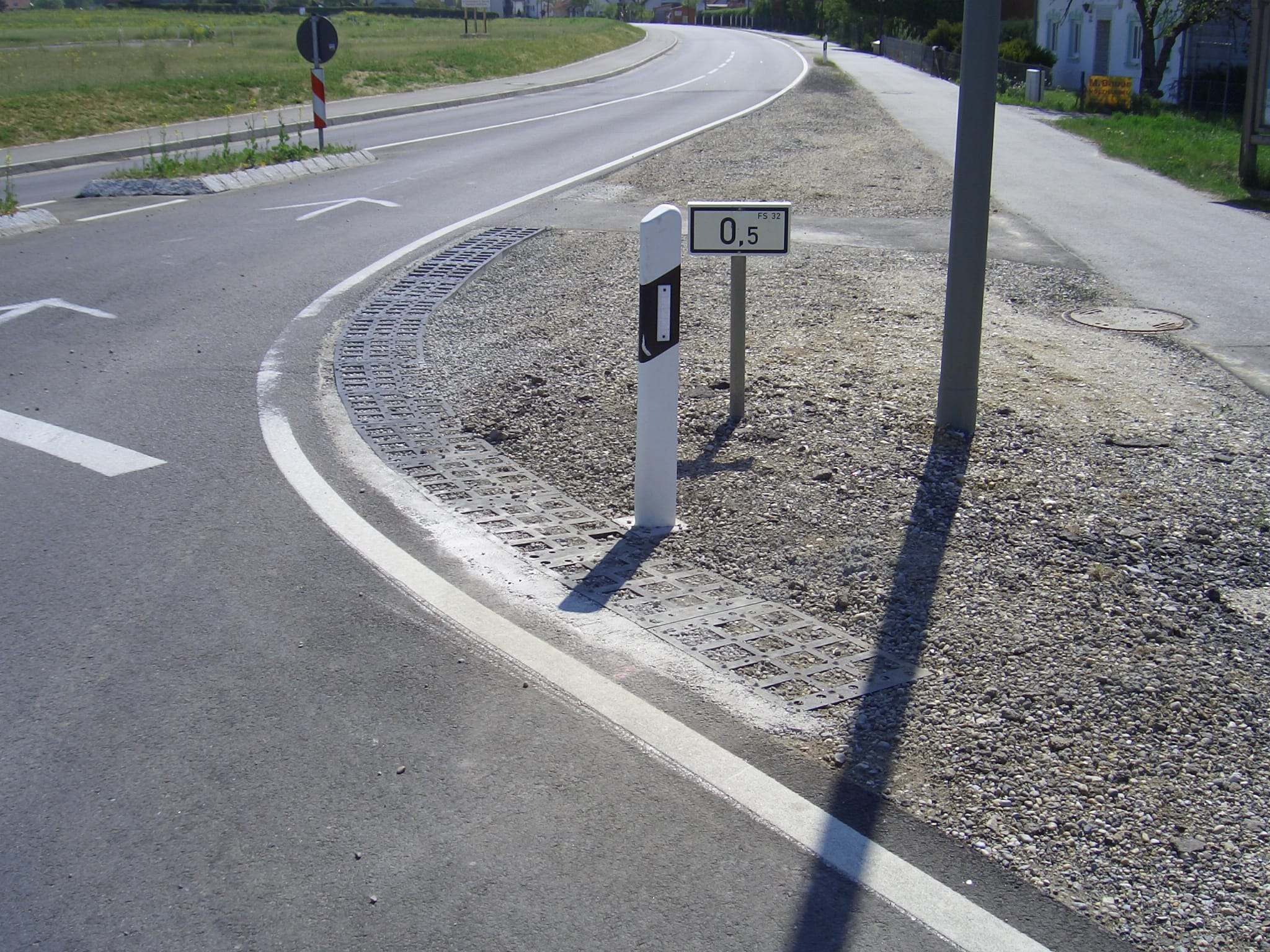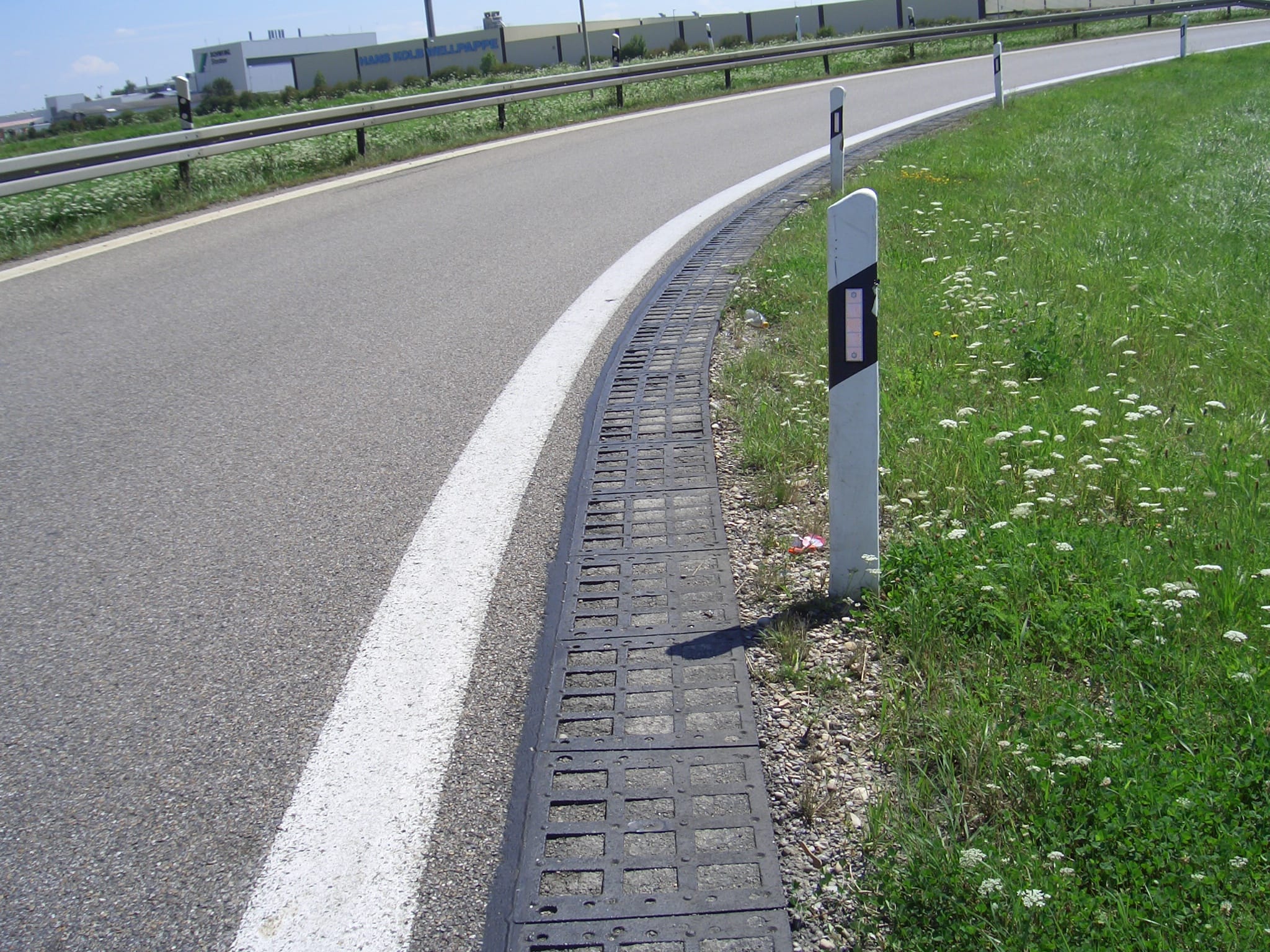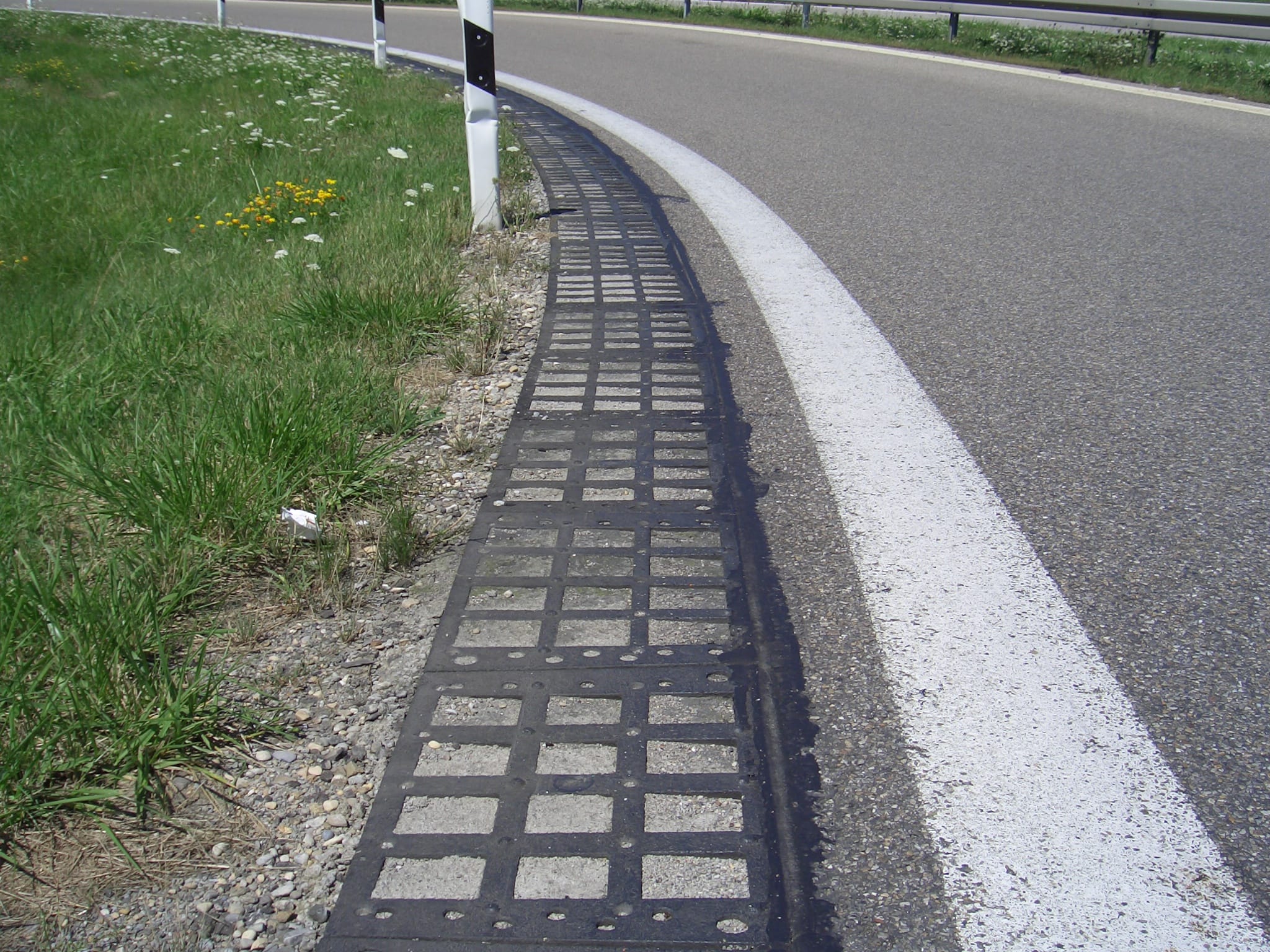 Fixés au système éprouvé de rainures et languettes, même les virages serrés peuvent être réalisés dans une structure entièrement composite. L’installation est réalisée avec des matériaux de construction adaptés, tels que du béton minéral ou du béton maigre. Des crampons sur les bords supérieurs et inférieurs assurent une bonne adhérence lors de l’installation et permettent un empilage facile et sûr pour le transport. La surface antidérapante, avec signal sonore lors du passage, offre une sécurité passive optimale au conducteur.