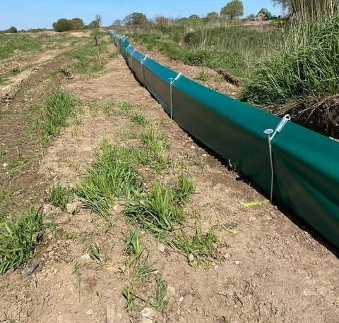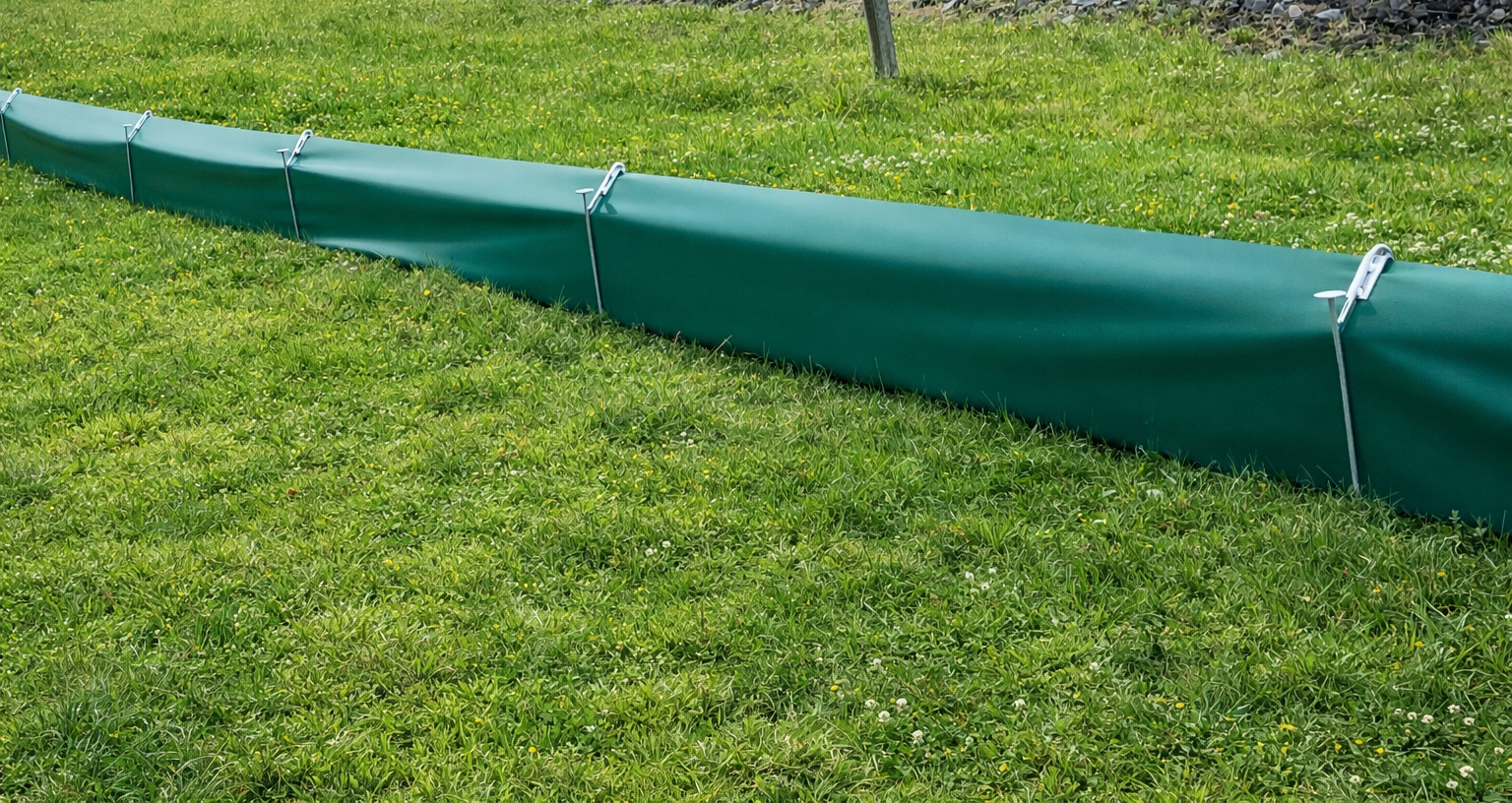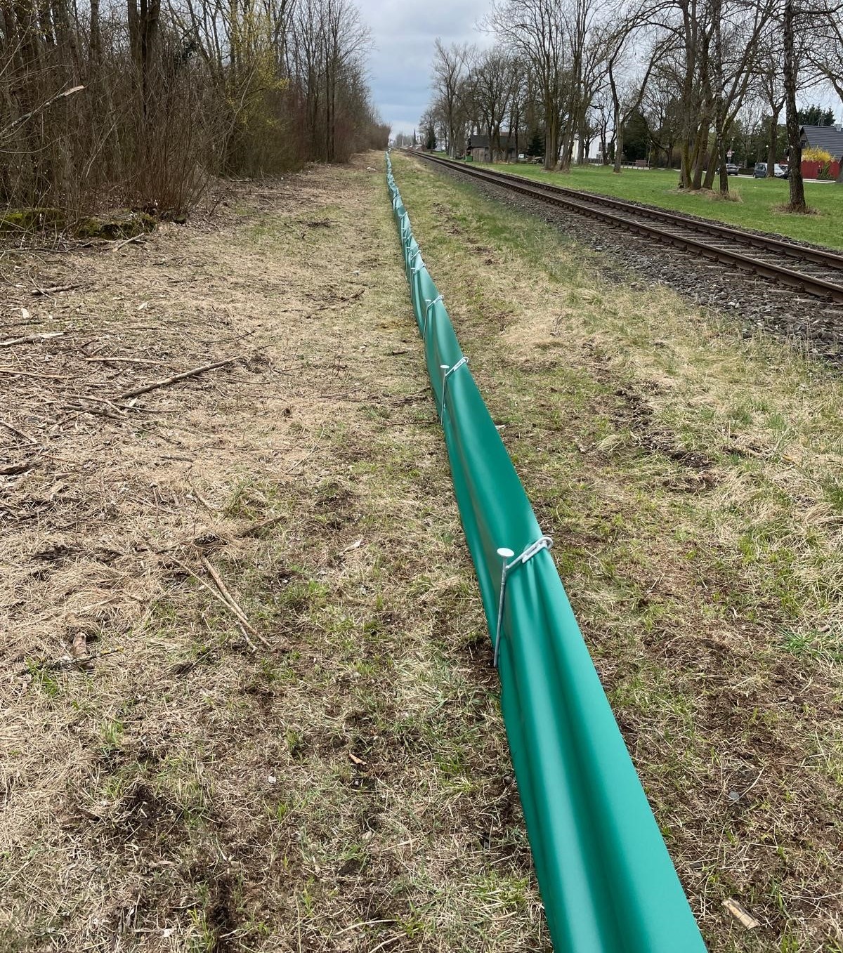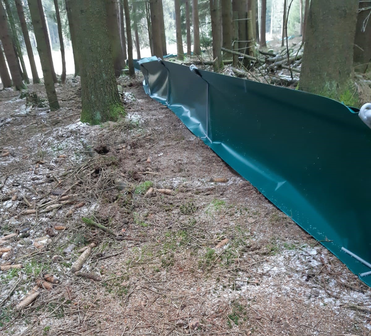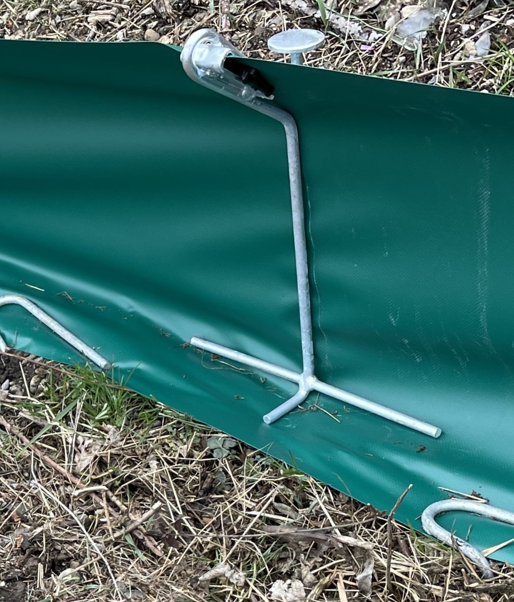 Freitragende Konstruktion mit Haltepfosten für Amphibien und Reptilien, oben 45° abgewinkelt (Überkletterschutz). Die beschichtete Gewebefolie besteht aus einer reißfesten, unverwüstliche Polyesterfaser und ist ca. 60 cm hoch, ohne Öffnungen und undurchsichtig. Eine extrem lange Lebensdauer wird durch UV-Bewitterungsschutz garantiert. Feuerverzinkte Netzniederhalter in einfacher aber effektiver Konstruktion machen das Eingraben der Gewebefolie überflüssig. Für die Befestigung an bestehenden Zäunen bekommen Sie eine Gewebefolie mit zusätzlich verstärkten Ösen im Abstand von 75 cm. Dadurch ist eine problemlose, feste und dauerhafte Verbindung zwischen Gewebefolie und Zaun möglich.
