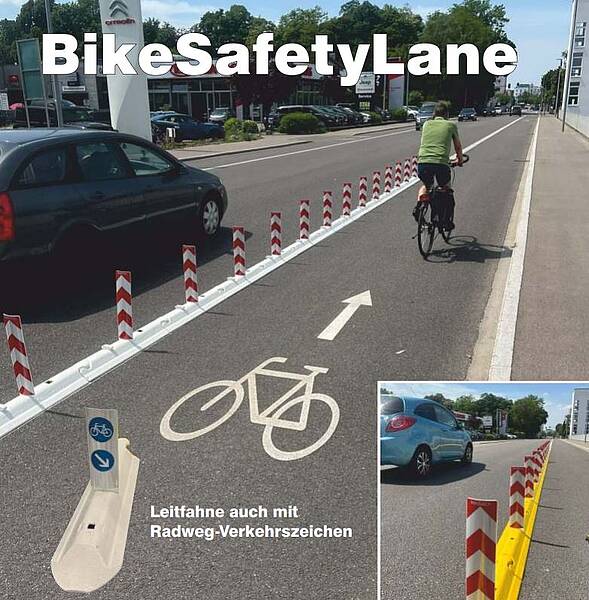 Zum Einsatz kommen nach TL Leitschwelle von der BASt geprüfte Leitschwellen und Standfüße mit Leitfahnen, die je nach Anforderung in verschiedenen Farben wie gelb oder weiß verfügbar sind. Dadurch lässt sich die BikeSafetyLane gut an unterschiedliche Straßenräume anpassen. Überfahrbare Leitfahnen mit Reflectfolie und integrierte Nachtreflektoren sorgen zusätzlich für eine hohe Sichtbarkeit bei Dunkelheit und schlechten Sichtverhältnissen und erhöhen so die Sicherheit für radfahrende Personen.